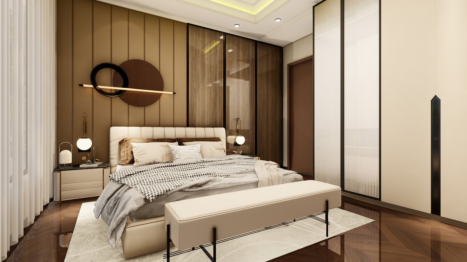 A finely curated super luxury bedroom designed by Vastukaar Studio, where warm tones, rich textures, sculptural lighting, and contemporary elegance come together to create an intimate, serene, and high-end retreat. This bedroom blends sophistication with comfort, offering a premium hotel-suite–like experience within the home.